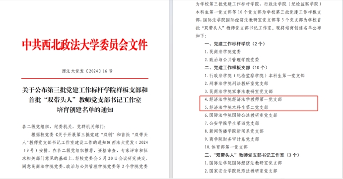 近日,校第三批党建工作标杆学院样板支部和首批“双带头人”教师党支部书记工作室培育创建名单公布,我院经济法学教师第一党支部、本科生第二党支部2个支部入选“样板支部”培育创建单位。