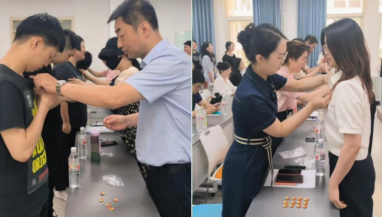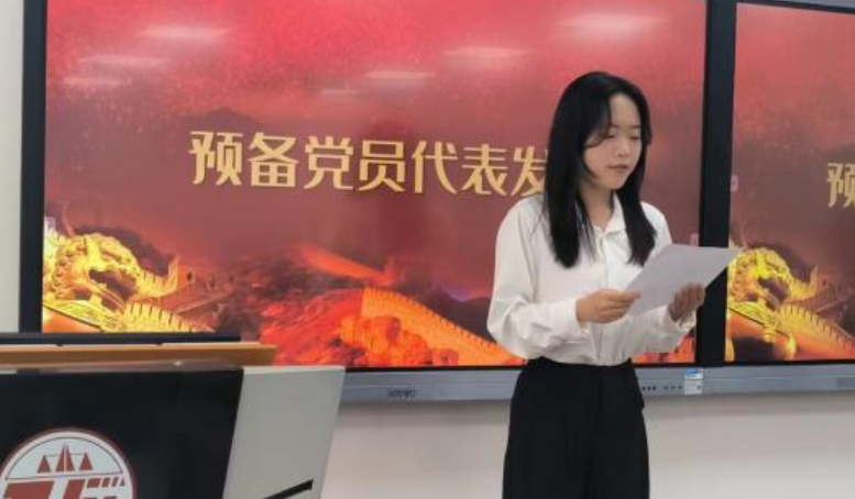 教师党员代表为30位新党员佩戴党员徽章,2022级孟成真代表新发展党员做表态发言,学院党委书记李建梅做总结讲话。