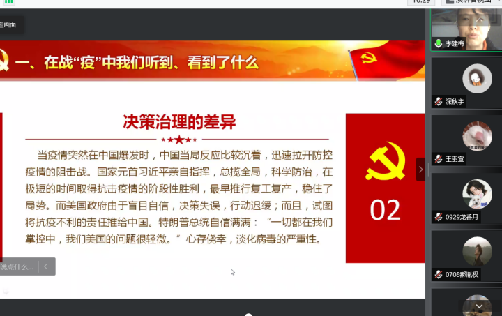 学院团委以团支部为单位开展线上“抗疫精神”主题团日活动。有的组织观看抗疫电影《中国医生》“弘扬抗疫精神,勇担青春使命”。有的阅读《“人民至上、生命至上”——抗击世纪疫情彰显“中国之治”优势》等新华社文章,有的则普及防疫常识、分享抗疫志愿者分享等活动,开展30余场,参与人数达1300人次,基本做到人人参与,共筑疫情防控防线,活动取得了良好效果。