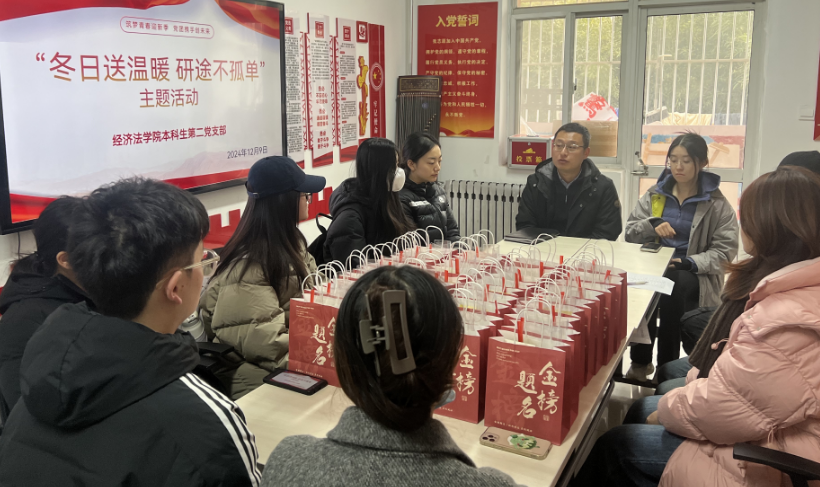 为帮助2025届考研学子坚定备考信心,缓解考试压力,传递温暖和祝福,鼓舞考研士气,营造和谐温暖的学习氛围,2024年12月9日上午10点,太阳成tyc7111cc集团本科生第二党支部联合2021级9班团支部在“一站式学生社区”开展“冬日送温暖,研途不孤单”考研冲刺动员大会,为考研学子送上考研暖心礼包,护航研途“最后一公里”。本科生第二党支部书记李冬冬,辅导员郗姝涵及2025届考研学生代表参加本次活动。