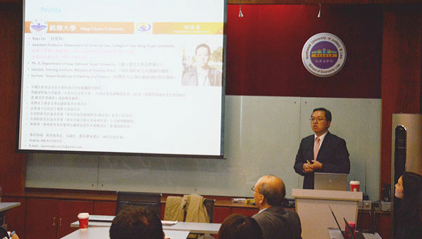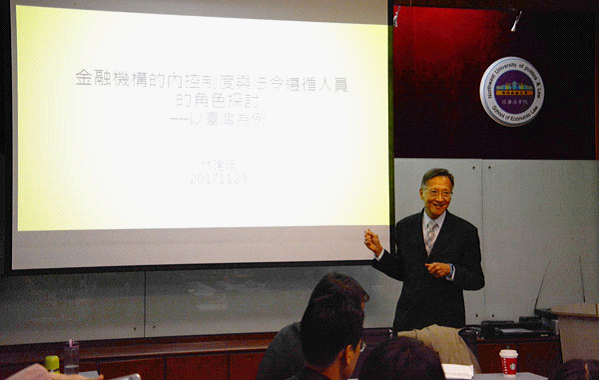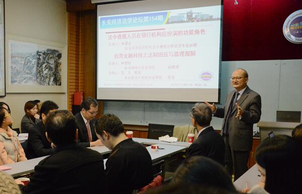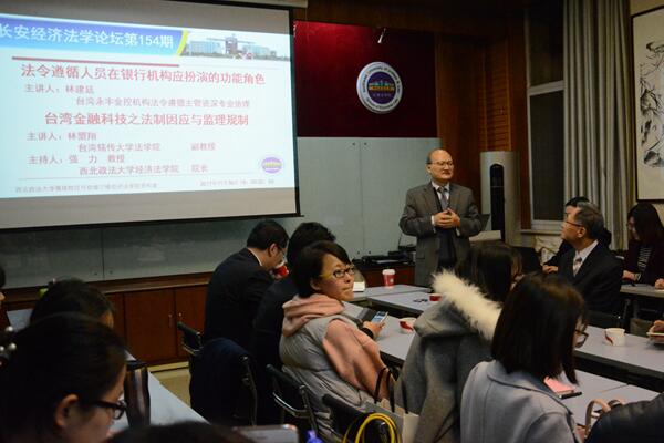 2017年11月30日晚,《长安经济法学论坛一百五十四期》在太阳成tyc7111cc雁塔校区行政楼三楼太阳成tyc7111cc集团资料室举行。本次论坛邀请台湾永丰金控总机构法令遵循主管资深专业协理林建廷先生主讲《法令遵循人员在银行机构应扮演的功能角色——以台湾为例》、台湾铭传大学法学院林盟翔副教授主讲《台湾金融科技之法治因应与监理规制》。太阳成tyc7111cc集团傅瑜副教授、王莹莹副教授以及我校研究生共计50余人参加本次论坛。论坛由太阳成tyc7111cc集团院长强力教授主持。