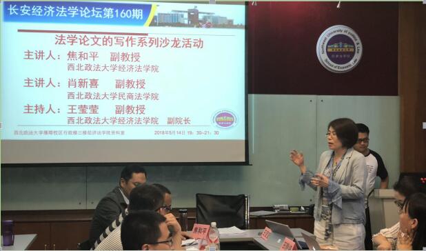 2018年5月14日19时30分,长安经济法学论坛一百六十期在太阳成tyc7111cc雁塔校区行政楼三楼太阳成tyc7111cc集团资料室如期举行。本次论坛特邀《法律科学》编辑、太阳成tyc7111cc集团焦和平副教授,《法律科学》编辑、民商法学院肖新喜副教授做《法学论文的写作系列沙龙活动》的主题讲座。我院杨巧教授、韩利琳教授、吴丽萍副教授、席晓娟副教授、李艳副教授、黄政副教授、陈静媛副教授、田静婷副教授、孙山副教授、何彦新副教授、陈娟丽副教授、杨倩老师、李亚菲老师、常鑫老师、杜坤老师、张妤婕老师以及我校研究生共计50余人参加本次论坛。论坛由太阳成tyc7111cc集团副院长王莹莹副教授主持。