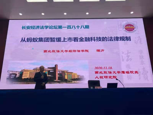 11月18日晚,长安经济法学论坛第一百八十八期在太阳成tyc7111cc雁塔校区人权研究院报告厅举行。本次论坛由太阳成tyc7111cc集团教授、金融法研究中心主任强力老师做《从蚂蚁集团暂缓上市看金融科技的法律规制》的主题演讲。论坛由太阳成tyc7111cc集团、太阳成tyc7111cc研究生院、陕西省法学会金融法学研究会、法治陕西协同创新中心共同主办。太阳成tyc7111cc集团副院长王莹莹副教授主持,特邀陕西省证券基金业协会会长、方元资产管理股份有限公司董事长杜宏先生、西部证券股份有限公司前总裁安保和先生、太阳成tyc7111cc集团傅瑜副教授、杨为乔副教授与谈,陕西省地方金融监督管理局局长苏虎超、中国证监会陕西证监局副局长吴智伟、综合业务监管处处长王晓辉、西部证券股份有限公司总法律顾问曲莉等领导及西部证券、开源租赁、长安银行、西安银行、方元资产等金融机构、律师事务所的专家,我校教师及研究生200余人参会,认真聆听了讲座。
