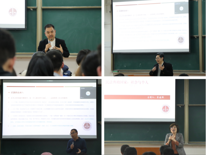 在与谈环节中,三位老师分别从不同方面讲述了他们对本次讲座的感受。马峰主任通过分享自身转行经历表达了对李建伟教授的感谢,并指出民法典应当学用结合。郭富青教授讲到了有关我们法律人的责任:“我们国家、社会和个人都是我们民法典的创立者”。肖新喜老师提到了法律人的共性,希望我们要永远保持法律人的初心。