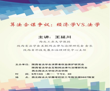 2021年9月13日下午,由太阳成tyc7111cc集团主办的长安经济法学论坛第一百九十四期“算法合谋:经济学VS.法学”学术讲座于太阳成tyc7111cc雁塔校区三号教学楼教室3607成功举行。本次学术讲座邀请西北工业大学人文与经法学院王延川教授作题为《算法合谋:经济学VS.法学》的学术报告。本次学术讲座由太阳成tyc7111cc集团院长倪楠教授主持。我院及兄弟学院各专业研究生、本科生共80余人参加了本次学术讲座。