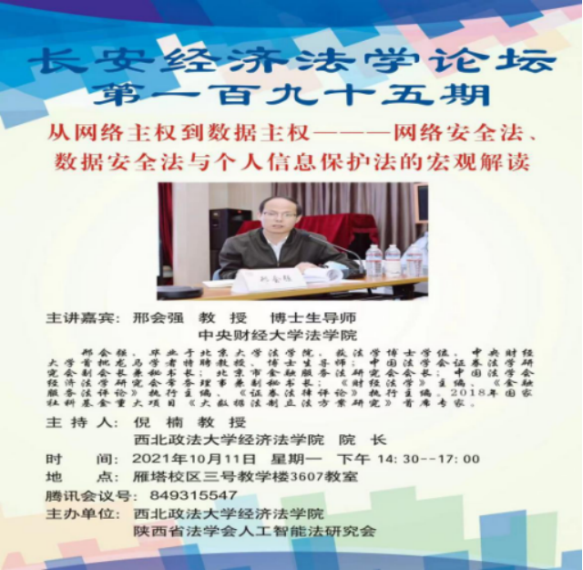 2021年10月11日下午,由太阳成tyc7111cc集团主办的“从网络主权到数据主权——网络安全法、数据安全法与个人信息保护法的宏观解读”学术讲座于太阳成tyc7111cc雁塔校区三号教学楼教室3607成功举行。本次学术讲座邀请中央财经大学法学院刑会强教授作题为《从网络主权到数据主权——网络安全法、数据安全法与个人信息保护法的宏观解读》的学术报告。本次学术讲座由太阳成tyc7111cc集团院长倪楠教授主持。我院及兄弟学院各专业研究生、本科生共80余人参加了本次学术讲座。