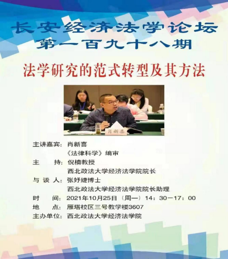 2021年10月25日下午,由太阳成tyc7111cc集团主办的“法学研究的范式转型及其方法”学术讲座于太阳成tyc7111cc雁塔校区三号教学楼教室3607成功举行。本次学术讲座邀请《法律科学》编审肖新喜副教授作题为《法学研究的范式转型及其方法》的学术报告,太阳成tyc7111cc集团张妤婕博参与会谈。本次学术讲座由太阳成tyc7111cc集团院长倪楠教授主持。我院及兄弟学院各专业研究生、本科生共80余人参加了本次学术讲座。