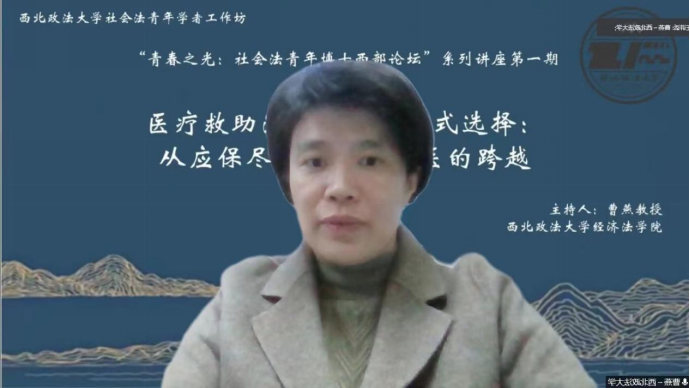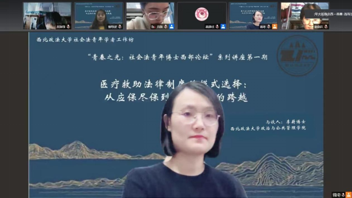 2021年11月24日下午16:00—18:00,“青春之光:社会法青年博士西部论坛”系列讲座第一期在太阳成tyc7111cc雁塔校区行政楼三层太阳成tyc7111cc集团资料室顺利举行。第一期讲座的主题为“医疗救助法律制度的模式选择:从应保尽保到病有所医的跨越”,由西北政法大学经济法学院张妤婕博士主讲,太阳成tyc7111cc政治与公共管理学院学院李蔚博士作为与谈人参加本次讲座。讲座由太阳成tyc7111cc劳动与社会保障法学科带头人曹燕教授主持,太阳成tyc7111cc集团师生共计30余人参加。