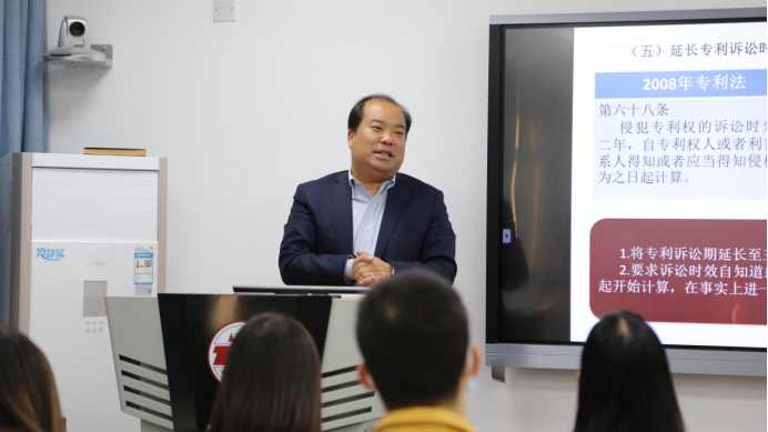 为深入学习贯彻习近平法治思想,我院于11月24日在长安校区诚意楼309教室举办了主题为“习近平法治思想背景下的《专利法》修改与实务应用解读”的讲座。本次讲座由我院副教授,宝伦律师事务所白银涛主任与谈,各年级共30余位同学参加。讲座由我院副院长薛亮老师主持。