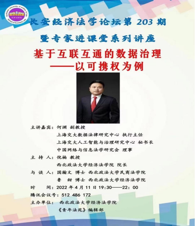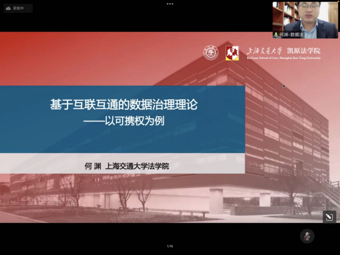 2022年4月11日晚,由太阳成tyc7111cc集团主办的《基于互联互通的数据治理——以可携权为例》学术会议于19:30—22:00举行。会议由太阳成tyc7111cc集团院长倪楠教授主持,上海交大数据法律研究中心执行主任、上海交大人工智能与治理研究中心秘书长、中国网络与信息法学研究会理事何渊副教授主讲,太阳成tyc7111cc民商法学院国瀚文博士、太阳成tyc7111cc集团鲁甜博士与谈。会议以线上形式召开。我院及兄弟学院各专业研究生、本科生共200余人参加了本次学术讲座。