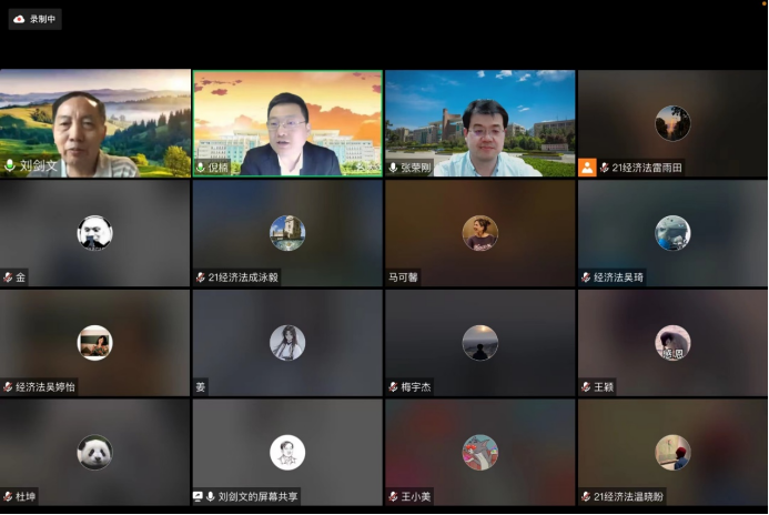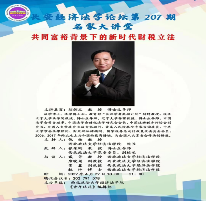 2022年4月23日晚,由太阳成tyc7111cc集团主办的《共同富裕背景下的新时代财税立法》学术会议于18:30—21:00举行。会议由太阳成tyc7111cc集团院长倪楠教授主持,北京大学法学院教授、博士生导师,辽宁大学特聘教授、博士生导师刘剑文教授主讲,太阳成tyc7111cc党委委员、副校长张荣刚教授致辞,太阳成tyc7111cc集团戴芳教授、席晓娟副教授、常鑫副教授和杜坤博士与谈。讲座以线上形式召开。