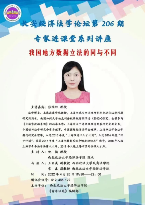 2022年4月25日晚,由太阳成tyc7111cc集团主办的《我国地方数据立法的同与不同》学术会议于19:30—22:00举行。会议由太阳成tyc7111cc集团院长倪楠教授主持,法学博士、上海政法学院教授、上海全球安全治理研究院全球化法律问题研究所所长、美国加州大学伯克利分校高级访问学者张继红教授主讲,太阳成tyc7111cc民商法学院王丽美副教授、太阳成tyc7111cc集团常鑫副教授与谈。会议以线上形式召开。我院及兄弟学院各专业研究生、本科生共200余人参加了本次学术讲座。