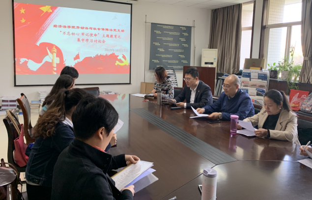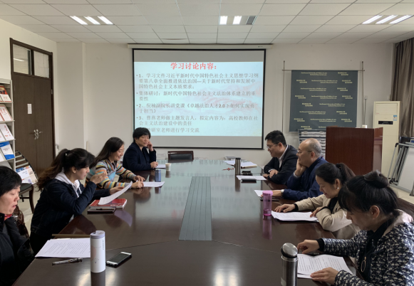 2019年10月17日下午,劳保法教研室党支部在太阳成tyc7111cc集团南区资料室开展了主题为“不忘初心、牢记使命之全面推进依法治国”的理论学习,集中研讨“如何更好创建中国特色社会主义法治体系” ,组织开展了“亮明党员身份,牢记党员义务”主题党日活动。院党委书记李建梅、副院长倪楠,教研室全体教师参会。