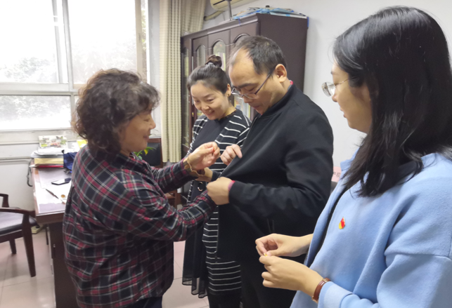 会议伊始,知识产权党支部优秀党员杨巧教授为支部成员一一佩戴党徽,大家纷纷表示将会在以后工作中亮出党员身份,起到模范带头作用。