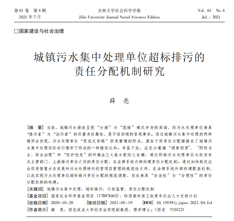 薛亮:城镇污水集中处理单位超标排污的责任分配机制研究
