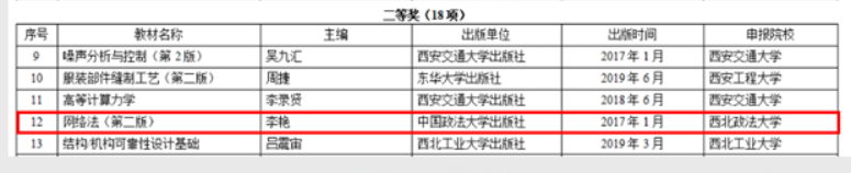 此前,我院杨巧教授主编教材《知识产权法学》获得2009年二等奖,郭捷教授主编教材《劳动法与社会保障法》获得2011年一等奖,李永宁教授、李集合教授、韩丽琳教授主编教材《环境资源法学》获得2016年二等奖。