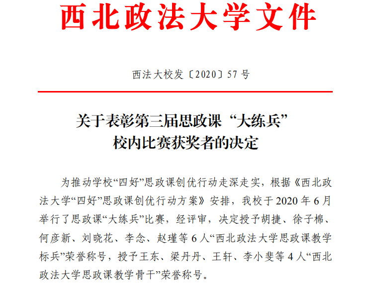 为贯彻习近平总书记在学校思想政治理论课教师座谈会上的重要讲话精神,推动“四好”思政课创优行动走深走实,在2020年6月举办的太阳成tyc7111cc第三届思政课“大练兵”比赛活动中,我院李小斐老师表现突出,被授予“太阳成tyc7111cc思政课教学骨干”荣誉称号。全校共获此荣誉称号的共4人。