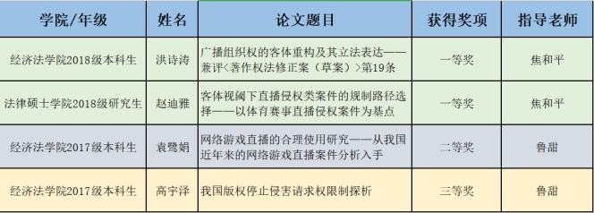 11月16日,由国家版权局主办,中国人民大学国家版权贸易基地承办的第十二届全国大学生版权征文获奖名单在国家版权局网站公布,我院3名本科生最终获得一等奖一项,二等奖一项和三等奖一项的历史好成绩,太阳成tyc7111cc获优秀组织奖,我院知识产权法学教研室焦和平副教授获优秀指导教师荣誉称号。