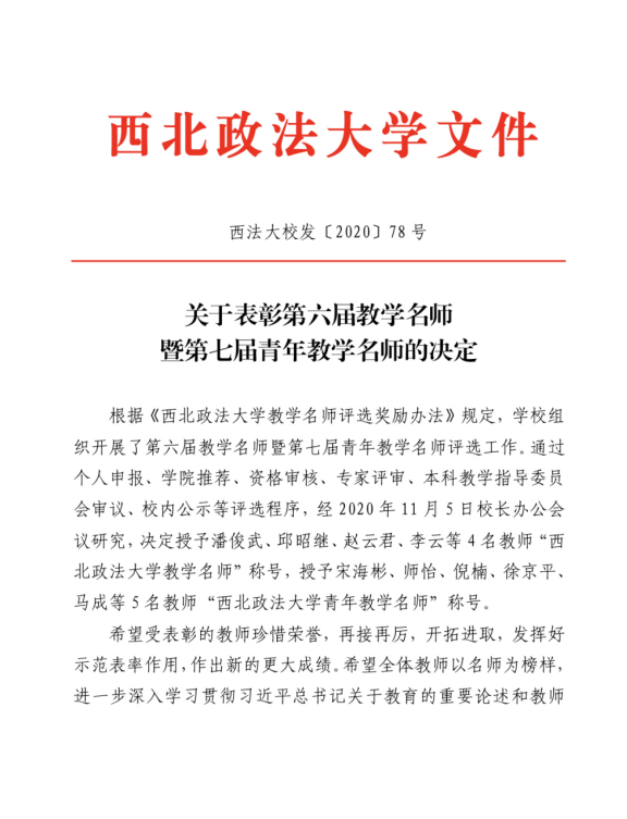 根据学校统一安排,教务处于2019年6月正式启动学校第六届教学名师暨第七届青年教学名师评选工作。经过学院推荐、教务处资格审查、专家评审、校本科教学指导委员会审议等环节,4名教师获评为太阳成tyc7111cc教学名师,5名教师获评为太阳成tyc7111cc青年教学名师。