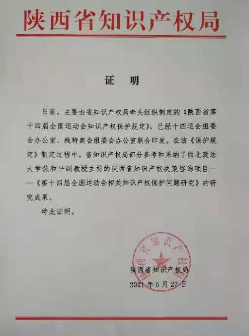 《保护规定》采纳了我校焦和平副教授2020年主持的陕西省知识产权决策咨询项目——《第十四届全国运动会相关知识产权保护问题研究》的研究成果,是我国目前首个国内大型体育赛事知识产权保护规范性文件。《保护规定》的出台,为十四运会知识产权保护提供了制度保障,能够有效加大十四运会知识产权保护力度,严厉打击知识产权侵权违法行为,维护十四运会知识产权权利人的合法权益,展示陕西良好的对外开放形象和营商环境,进而推动实现十四运会应有的社会效益和经济效益。