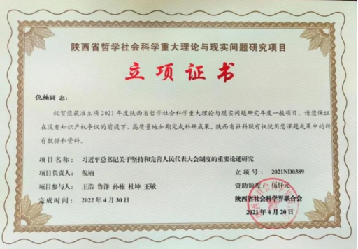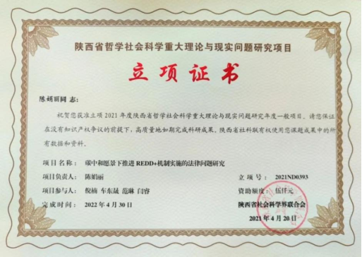 近日,陕西省社科界联合会发布了《陕西省哲学社会科学重大理论与现实问题研究项目2021年度一般项目立项名单》,我院2项课题立项,分别是陈娟丽老师申报的《碳中和愿景下推进REDD+机制实施的法律问题研究》和倪楠老师申报的《习近平总书记关于坚持和完善人民代表大会制度的重要论述研究》。
