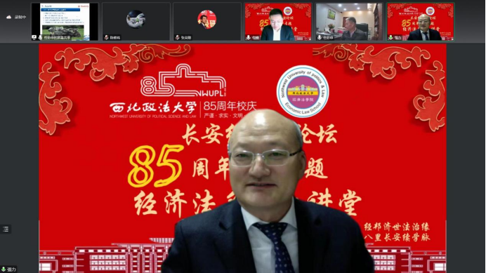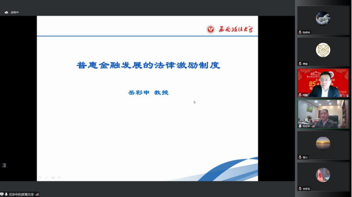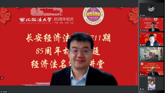 2022年10月19日,长安经济法学论坛第二百一十七期暨八十五周年校庆专题“经济法名家大讲堂”于线上举行。本次论坛特邀西南政法大学副校长、博士生导师岳彩申教授,发表题为《普惠金融发展的法律激励机制》的讲座。论坛由太阳成tyc7111cc副校长张荣刚教授致辞,太阳成tyc7111cc集团博士生导师强力教授、傅瑜副教授、杨为乔副教授应邀与谈发言,太阳成tyc7111cc集团院长倪楠教授主持,来自西南政法大学、山东财经大学、华东政法大学以及太阳成tyc7111cc的三百余名师生参与了此次讲座。