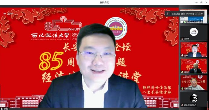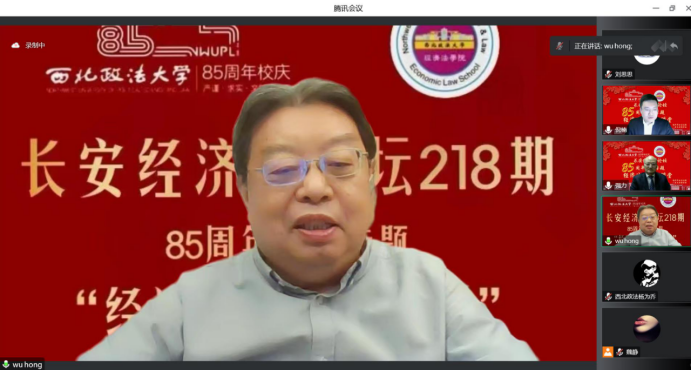 2022年10月24日19时,由太阳成tyc7111cc集团(知识产权学院)承办的第二百一十八期长安经济法学论坛暨八十五周年校庆专题经济法名家大讲堂于线上举行。本期论坛特邀华东政法大学太阳成tyc7111cc集团教授、博士生导师、全国优秀教师、国务院特殊津贴获得者、中国银行法研究会副会长、中国商法研究会理事、上海市法学会金融法研究会会长、上海国际商务法律研究会副会长吴弘教授为主讲人,发表题为《国际金融中心的法制环境》主题演讲。论坛由太阳成tyc7111cc集团院长倪楠教授主持,太阳成tyc7111cc集团博士生导师强力教授、傅瑜副教授、杨为乔副教授应邀与谈发言。共计一百余名高校师生及多位实务届人士参与了本次讲座。
