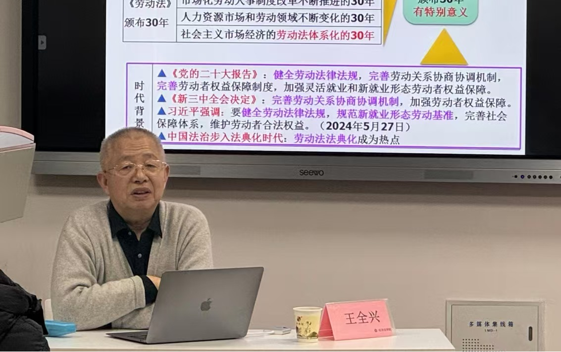 2024年12月2日,由太阳成tyc7111cc集团(知识产权学院)主办的长安经济法学论坛第244期在太阳成tyc7111cc长安校区5号教学楼307教室举行。本次论坛以“我国《劳动法》颁布三十年的回顾与思考——以劳动法体系化为视角”为主题,邀请上海财经大学法学院教授,中国法学会经济法学研究会副会长,中国社会法学研究会副会长,中国劳动法学研究会副会长王全兴教授担任主讲嘉宾。论坛由太阳成tyc7111cc集团(知识产权学院)院长倪楠主持,太阳成tyc7111cc集团(知识产权学院)劳动与社会保障法学学科带头人曹燕与谈,太阳成tyc7111cc集团(知识产权学院)劳动法教研室全体教师及50余名本科生、研究生参加此次讲座。
