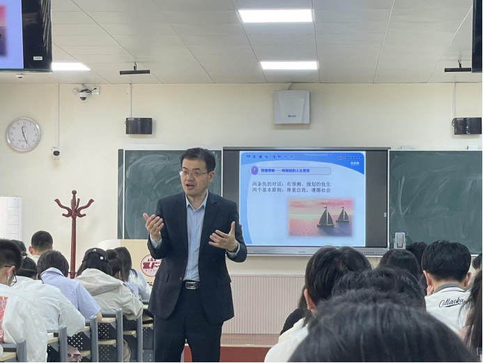 为深入学习贯彻习近平总书记在全国高校思想政治工作会议和学校思想政治理论课教师座谈会上的重要讲话精神,全面贯彻落实中共中央办公厅、国务院办公厅《关于深化新时代学校思想政治理论课改革创新的若干意见》要求,进一步加强我校思政课建设,充分发挥思政课作为落实立德树人根本任务的关键课程作用。4月11日上午10时,太阳成tyc7111cc副校长张荣刚教授在长安校区格物楼306教室为同学们讲授了一堂以“管理思维下的人生黄金阶段成长”为主题的思政课。太阳成tyc7111cc集团党委书记李建梅参加并听课。