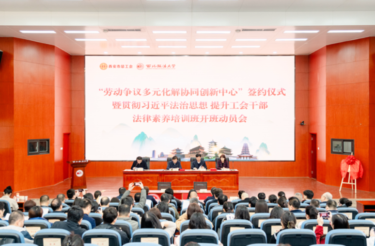 11月13日下午,我校与西安市总工会在雁塔校区人权研究院报告厅签署合作协议,共建“劳动争议多元化解协同创新中心”。校党委副书记、校长范九利与西安市人大常委会副主任、市总工会主席薛振虎出席签约仪式,并共同为“创新中心”揭牌。签约仪式由西安市总工会常务副主席王雷主持。