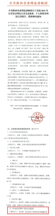 近日,中共陕西省委理论讲师团印发《关于表扬2023年全省基层理论宣讲先进集体、个人和优秀理论宣讲报告、微视频的通知》,我院辅导员来沅晖创作的《弘扬延安精神传承红色基因》荣获“全省优秀理论宣讲微视频”。