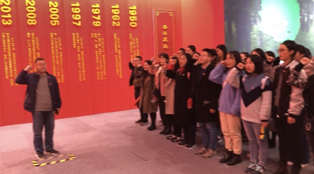 参观过程还融入了党员宣誓活动,由支部书记王文老师领誓,全体支部成员重温入党誓词,用铿锵有力的语调和诚挚的话语,表达了自身坚定不移的爱党、信党、跟党走的政治信念,在同学们心中产生了强烈的共鸣。