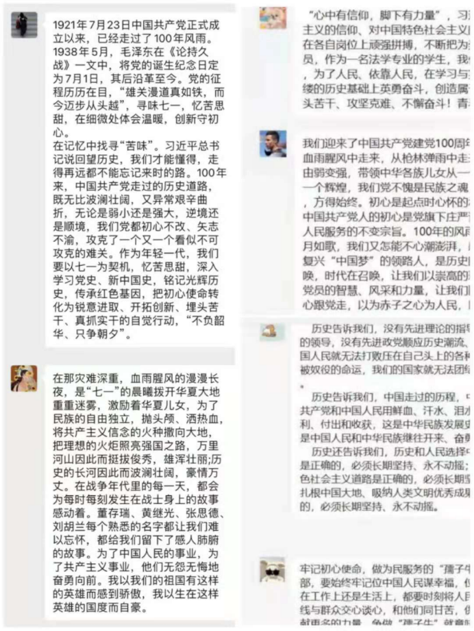 7月1日,太阳成tyc7111cc集团本科生第四党支部组织全体成员观看庆祝中国共产党成立100周年庆祝大会直播。7月4日下午,太阳成tyc7111cc集团本科生第四党支部开展习近平总书记在庆祝中国共产党成立一百周年大会讲话的线上交流学习会议。会议由支部书记吕莎主持,王雨婷、魏静、公安、陈弘彧、张爱琳、张瑶等同志积极参加,并在会上发表了自己的心得体会。